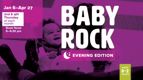 Our Evening Edition of Baby Rock is held on the 2nd and 4th Thursday, January 9 through April 23, in the Book Nook at 6:00. We also offer morning Baby Rock that meets every Monday morning at 10:00 from January 6 through April 27.