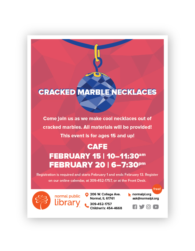Learn how to turn a clear marble into a beautiful centerpiece in a necklace. The library will supply all materials.