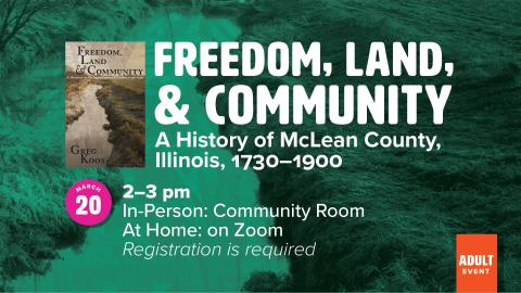 Greg Koos, Executive Director Emeritus of the McLean County Museum of History, presents on his recently published book. Freedom, Land, and Community: A History of McLean County Illinois, 1730‐1900 tells the story of the diverse peoples and events of this county. Using sources contemporary with the events described, it relates the struggle to shape the land, build community, and secure freedom as these communities knew and defined it. Native peoples, women and men, African Americans, Irish and German immigrants all sought and contested for their freedom. People whose voices have not been heard in previous works about Central Illinois are included here.