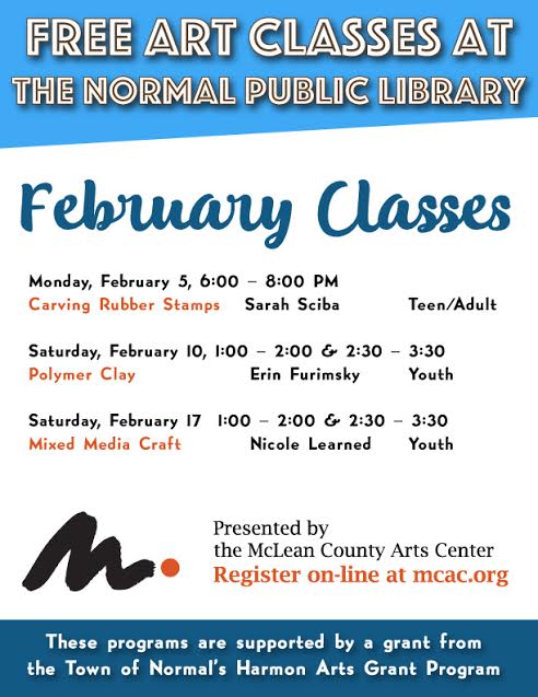 The McLean County Arts Center is pleased to present the Spring 2018 Harmon Arts Workshops. Funded by a grant from the Town of Normal, this workshop series is organized by the McLean County Arts Center and hosted by the Normal Public Library.