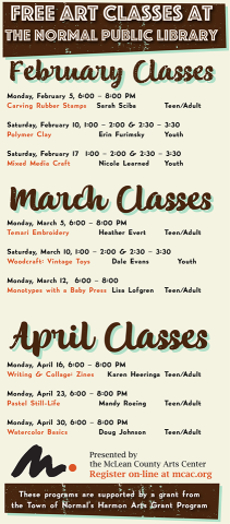 The McLean County Arts Center is pleased to present the Spring 2018 Harmon Arts Workshops. Funded by a grant from the Town of Normal, this workshop series is organized by the McLean County Arts Center and hosted by the Normal Public Library.