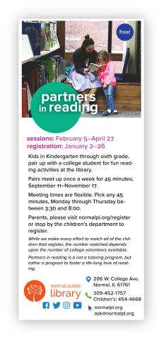 Kids in Kindergarten through sixth grade, pair up with college students for fun reading activities at the library. Pairs meet once a week for 45 minutes, February 5 - April 27.