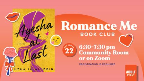 Check out NPL's romance book club! We'll be discussing mostly romantic fiction, along with some love-related nonfiction. December's pick: Ayesha at Last by Uzma Jalaluddin. Some copies available for checkout at NPL; audio and e-books available on Libby. Since love is love, our choices will reflect romance between various couples and cultures, and all genders are welcome to respectfully attend these discussions. Be prepared to talk about sweet, steamy, or downright hilarious content as we spill our thoughts about this month's read. Love is in the air at our Romance Me Book Club!