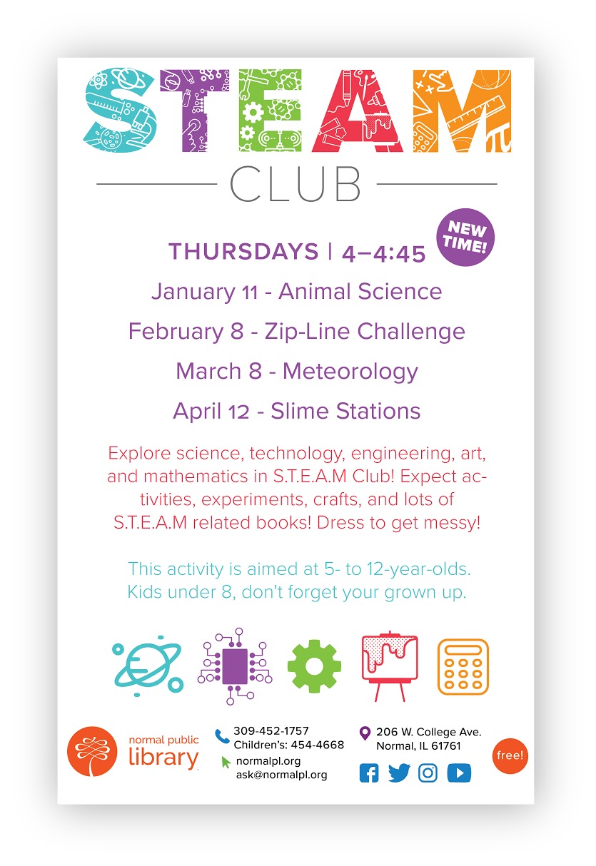 Join us on the second Thursday of the month for STEAM Club Meetings! *Now at a new time!*
