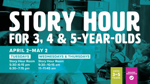 Foster an early love of learning and reading in your children through our Story Hour Program. Three-, four-, and five-year-olds are invited to attend a weekly 45-minute program to enjoy stories, songs, games, and crafts.