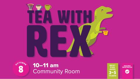 A librarian and T-Rex will team up to deliver stories and songs, followed by snacks. Don't forget your camera to get a picture with Rex!