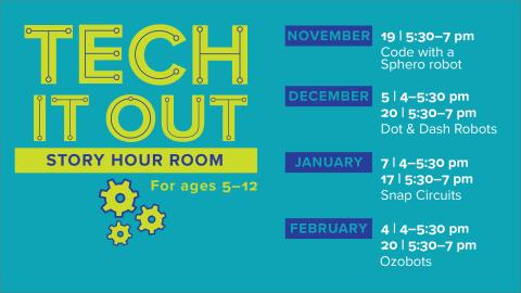 Drop in for a chance to Tech-It-Out with gadgets in our Story Hour Room! Kids between the ages of 5 and 12 will have the opportunity to engage their problem-solving skills and experience real-world applications of science, engineering, programming, and more!