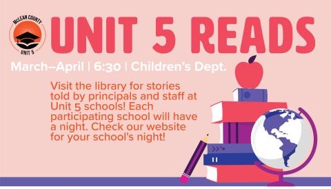Visit the library for stories told by principals and staff at Unit 5 schools. Each participating school will have a night with one featured guest reader. All Unit 5 Reads events begin at 6:30 in the Book Nook.