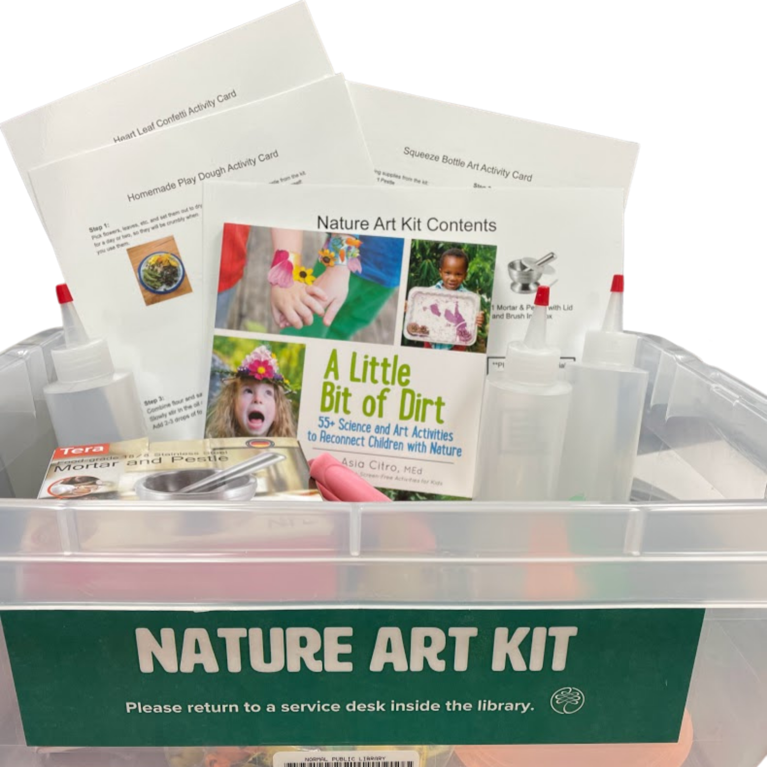 Kit with instructions and supplies for three activities all incorporating nature: Making homemade play dough, art using a squeeze bottle, and making heart leaves.